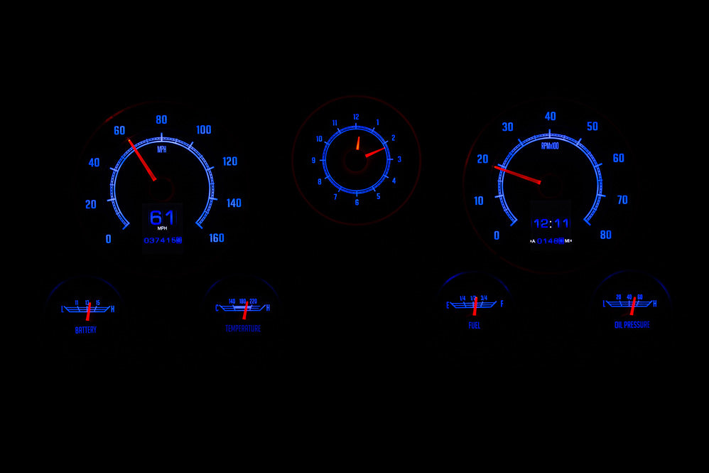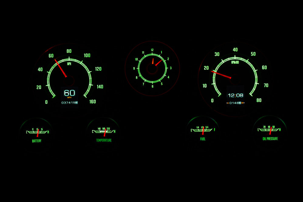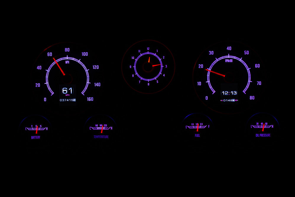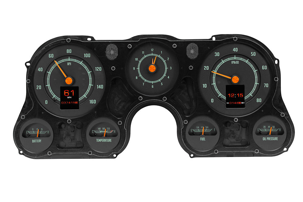 This is as close to stock as you can get while enjoying color-changing LED backlighting, dual TFT message centers and of course late-model drivetrain compatibility. The analog clock in the center position seals the deal. 67-72 truck blazer suburban RTX gauges is what you've been waiting for! *Bezel not included, shown for visual/presentation purposes. System uses OEM or reproduction style bezel.
