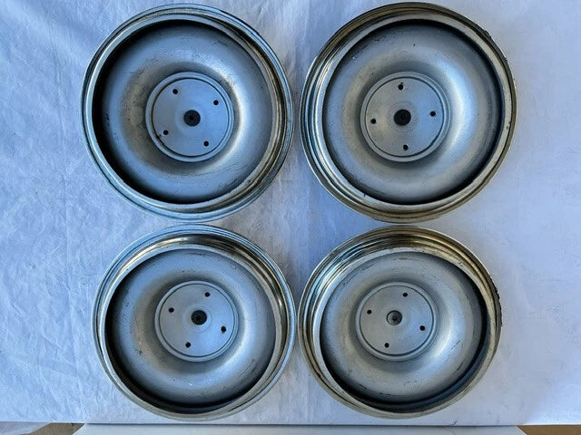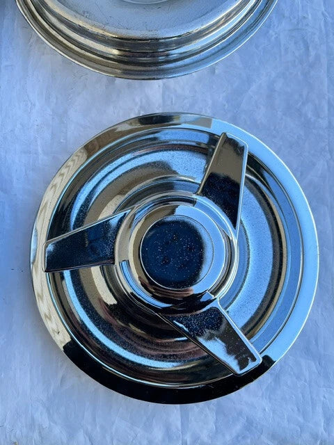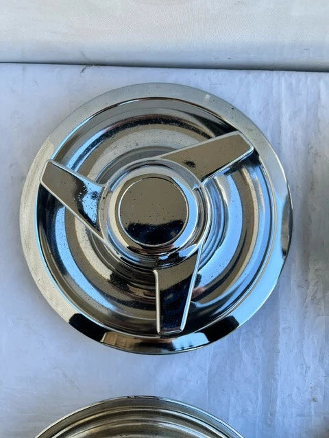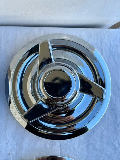 Used set of aftermarket 3 tri-bar spinner center hub caps for any Chevy GM (Camaro Chevelle Nova El Camino Monte Carlo Malibu and Blazer Suburban C/k pickup truck) 5 lug rally wheels 14x6 up to 15x10 wheels. Item is in ok condition due to item showing signs of pitting, this is for a set of 4 so a complete set of center caps